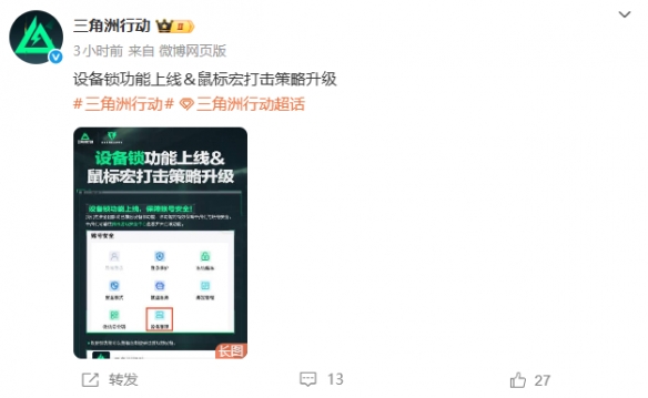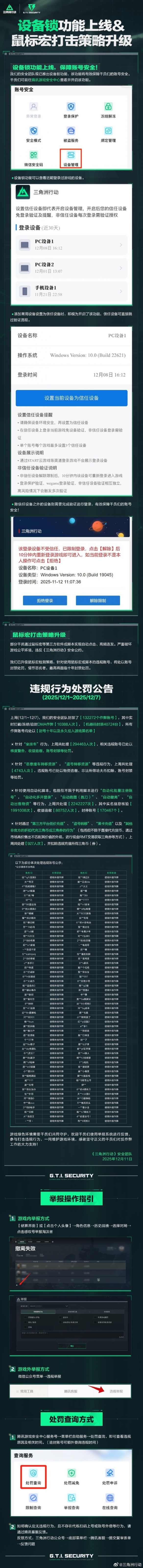 腾讯《三角洲行动》于2025年12月11日宣布,其游戏安全功能迎来重大升级:全新的设备锁功能正式上线配资开户门户导航,同时针对鼠标宏等作弊行为的打击策略也进行了全面强化。